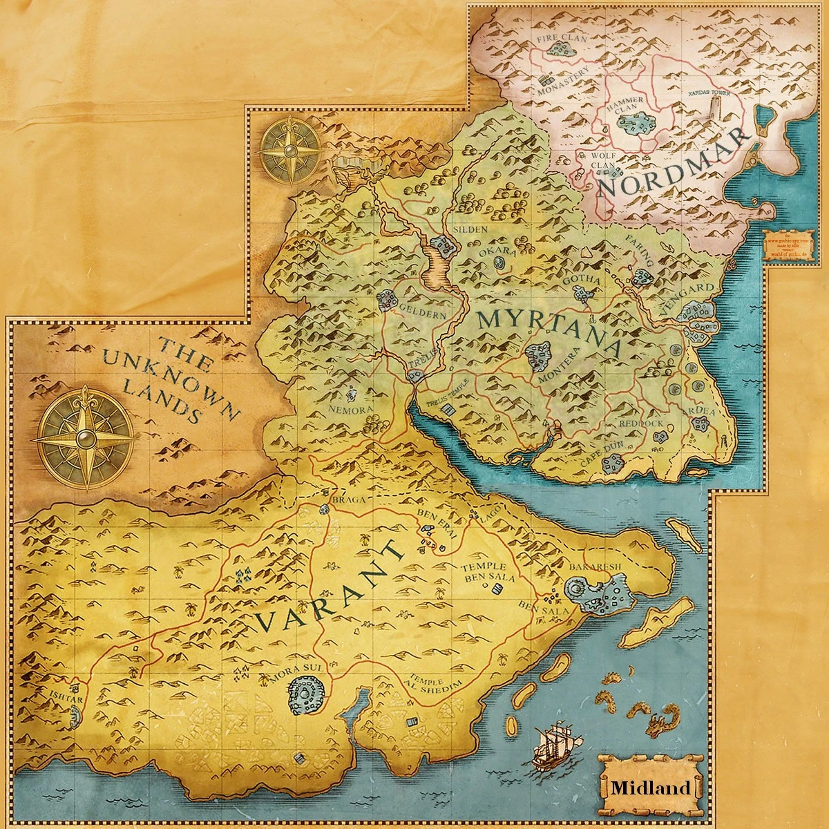 Midland je veliký kontinent. Hranice civilizovaného světa začínají na samém severu Nordmaru, za vysokými horami, které tvoří přírodní hranici se nacházejí pravděpodobně skřetí země. Dále pohoří vedou po západě kontinentu, od Nordmaru až po jih Varantu. Za západními horami se nacházejí tzv. Neznámé země. Východní hranici kontinentu tvoří myrtanské moře, které oblévá pobřeží od severu Varantu až po jih Varantu.