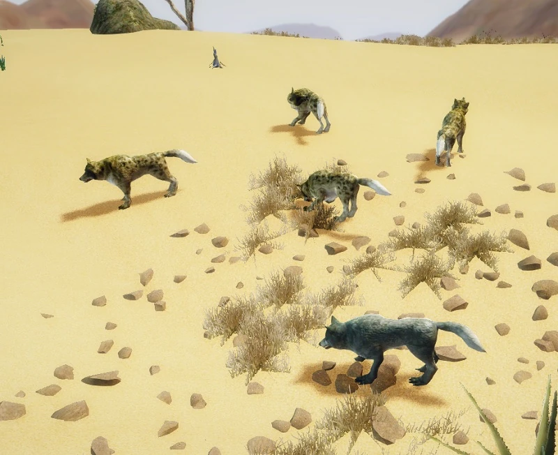 Diese wolfartigen Tiere treten nahezu immer in Rudeln auf und streifen durch verschiedene Teile der Wüste, wo sie überall vorkommen.