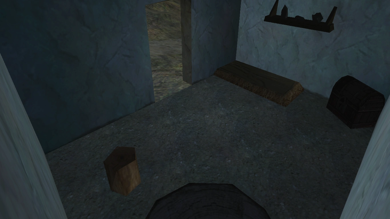W środku tejże budowli znajduje się łóżko, skrzynia i półka z przeróżnymi przedmiotami, takimi jak żywność czy mikstury. Naprzeciw tych rzeczy znajduje się krzesło zrobione z pnia i stół.