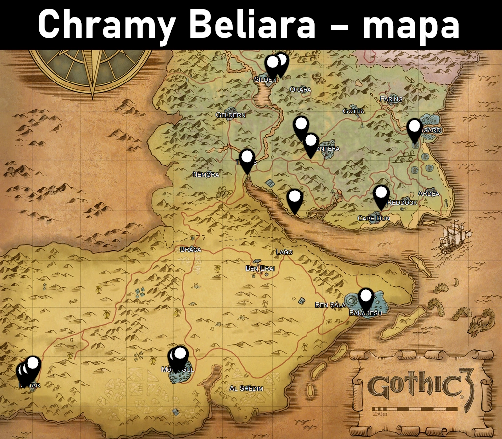 Chramy Beliara występują najczęściej w miastach asasynów oraz orków, którzy również z niego korzystają. Łącznie można znaleźć 14 posągów.