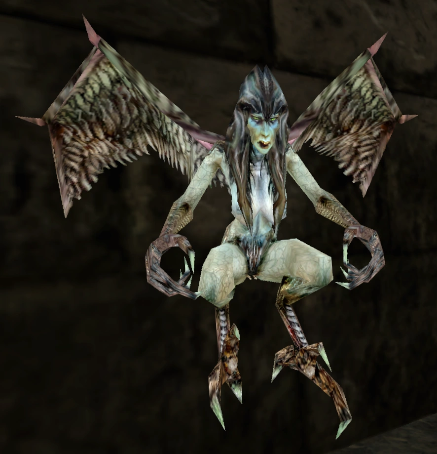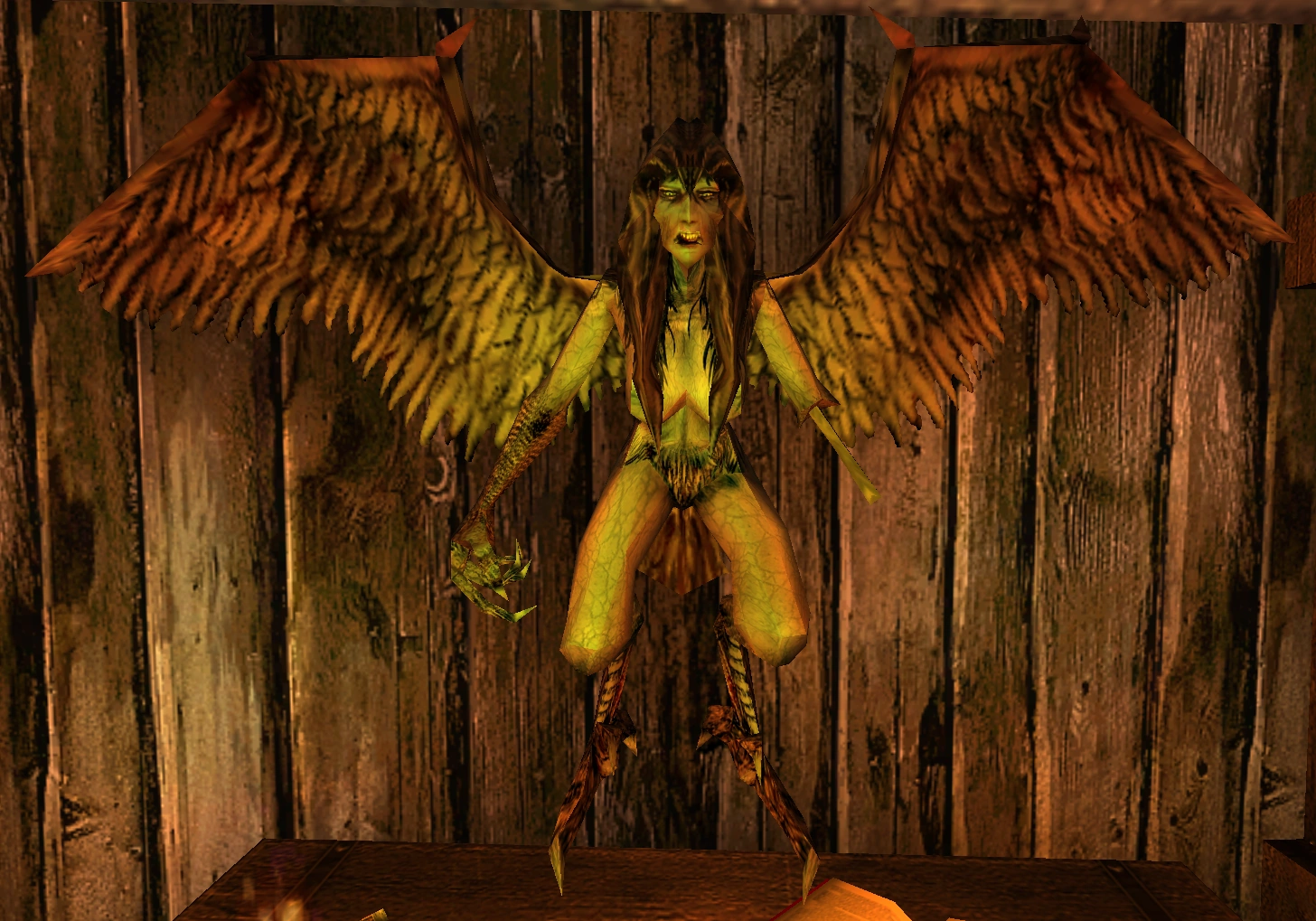 Harpie można spotkać w kanionie trolli i górskiej fortecy. Zazwyczaj występują w grupach po cztery do pięciu osobników. Swoją ofiarę atakują z powietrza, uderzając ostrymi szponami. Wydają z siebie charakterystyczne odgłosy przypominające ludzkie chichoty oraz krzyki. W grze występuje też obraz przedstawiający wojownika walczącego z harpią.
