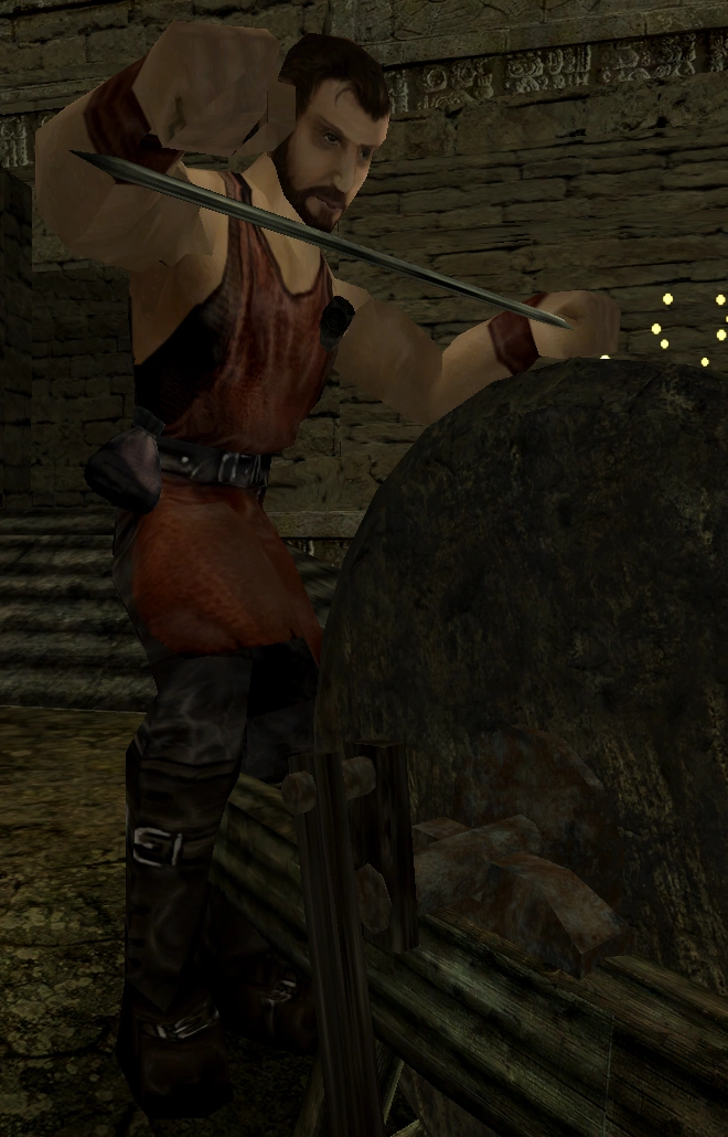 Ponadto może nauczyć protagonistę wykuwania różnych mieczy. O ile opanowanie sporządzenia niewykończonego miecza jest dostępne od razu i bez względu na gildię, tak nauka kucia lepszych broni jest zarezerwowana dla strażników i magnatów.