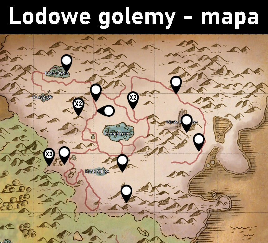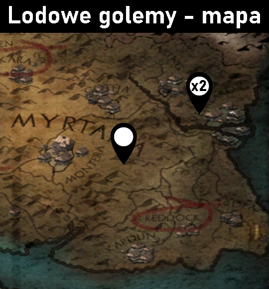 Mapa z zaznaczonym położeniem lodowych golemów w Gothic 3