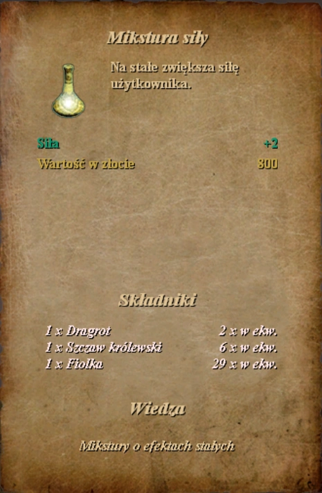 Po wypiciu mikstura dodaje 2 punkty siły na stałe (3 z alternatywnym balansem). Jej wartość sprzedaży wynosi 240 sztuk złota, a przy odkupie cena rośnie do 800 sztuk złota.