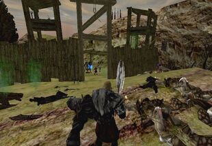 Obóz łowców orków – mały ufortyfikowany obóz znajdujący się na terytoriach orków. Ataki zielonoskórych skupiają się na tym obozie. Sam przywódca – Valkir – mówi, że obóz powstał nie po to, by zabijać orków, ale żeby najagresywniejsi ludzie w Kolonii mieli ciekawe zajęcie. Podczas wykonywania zadań Bezimienny może otrzymać od jednego z łowców orków zestaw do gry w kości, dzięki któremu może zarobić trochę rudy, ale też ją stracić.