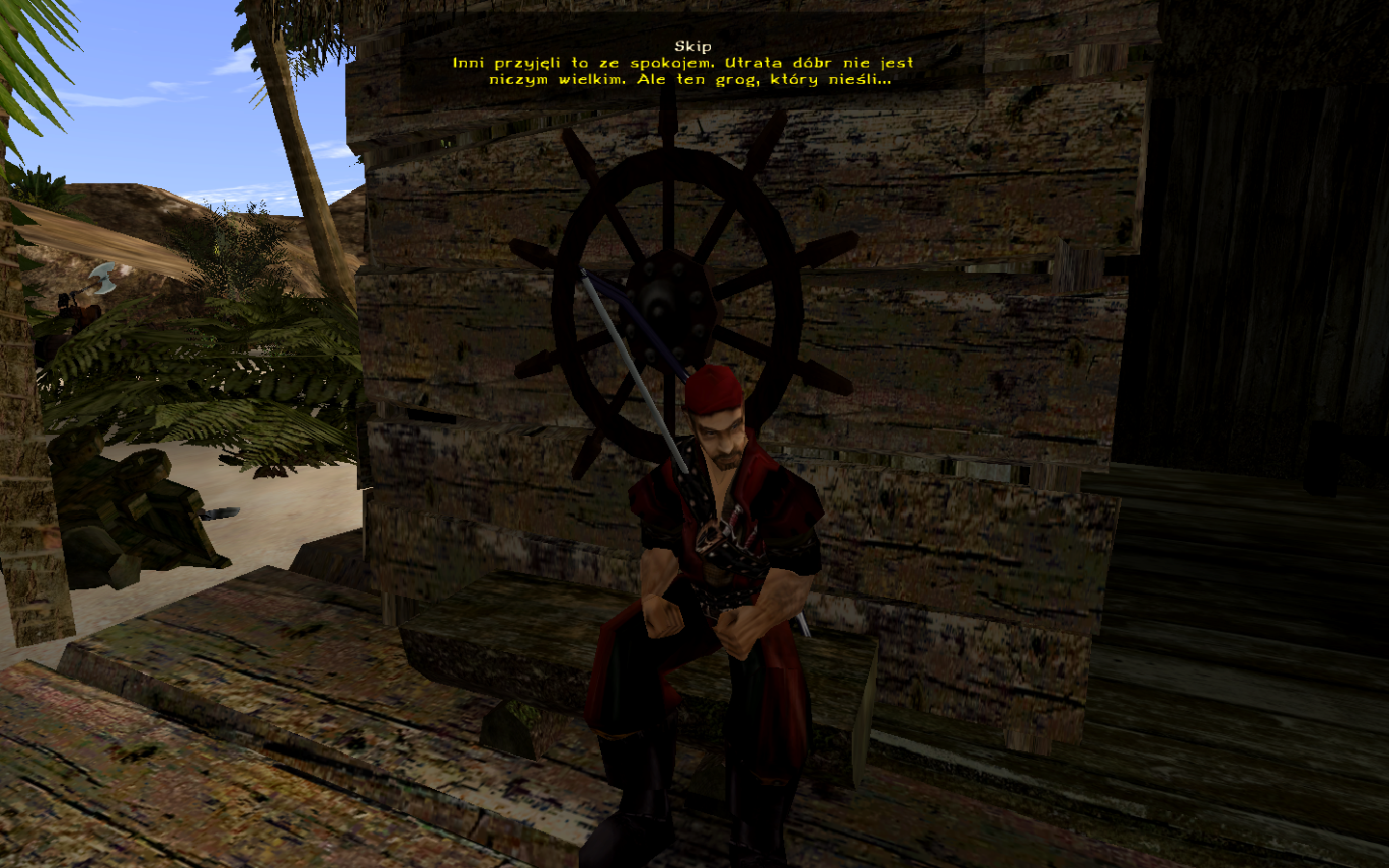- Porozmawiaj ze Skipem przed jego chatą w obozie piratów.