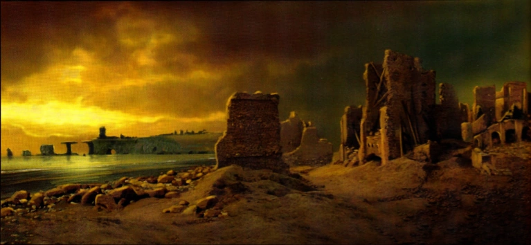 Ilustracja koncepcyjna ruin Pradawnych w Varancie, wykorzystana później jako tło ekranów menu