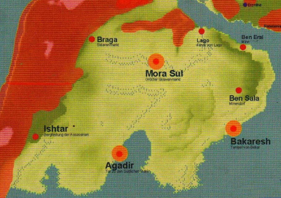 - Al Shedim – ruiny starożytnego miasta z wielką świątynią w centrum. Badania prowadzą tutaj Saturas i Myxir. Ochraniają ich koczownicy Wutrasa, który planuje atak na prowadzących wykopaliska orków pod wodzą Tamkoscha. Jednym z orkowych niewolników jest Lester.