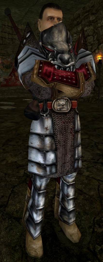 Шаблон:GPT У неё темный цвет лица. Он носит доспехи стражника и имеет характерную маску в виде черепа. Он пренебрежительно относится к Безымянному. Он спрашивает, может ли он держать меч и утверждает, что не сможет убить снеппера, но дает ему шанс в одном из квестов. Задача состоит в том, чтобы предоставить ему Волчий клык и мясо снеппера, чтобы он мог выплатить долг Драксу и Рэтфорду. У него хорошие отношения с Диего. Он должен впустить героя дальше, когда погаснет Предупреждающий огонь на Сторожевой башне возле площадки обмена, но не может этого сделать, так как игра заканчивается.