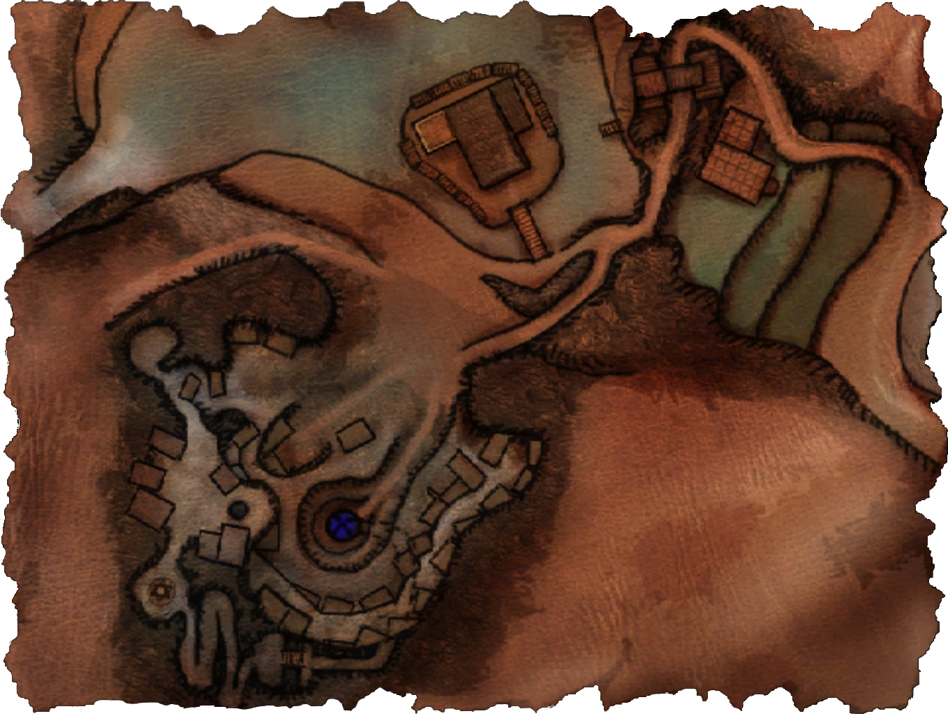 План охватывает территорию от тропы за входными воротами, через рисовое поле и гостиницу на озере, до самого лагеря с четко обозначенным курганом руды, пентаграммой в штаб-квартире Магов Воды и потайной проход, ведущий от неё к решетке, защищающей курган. Однако здесь нет Свободной шахты — единственный признак, указывающий на существование чего-то за пределами лагеря, — это разбитая тропа рядом с ним.